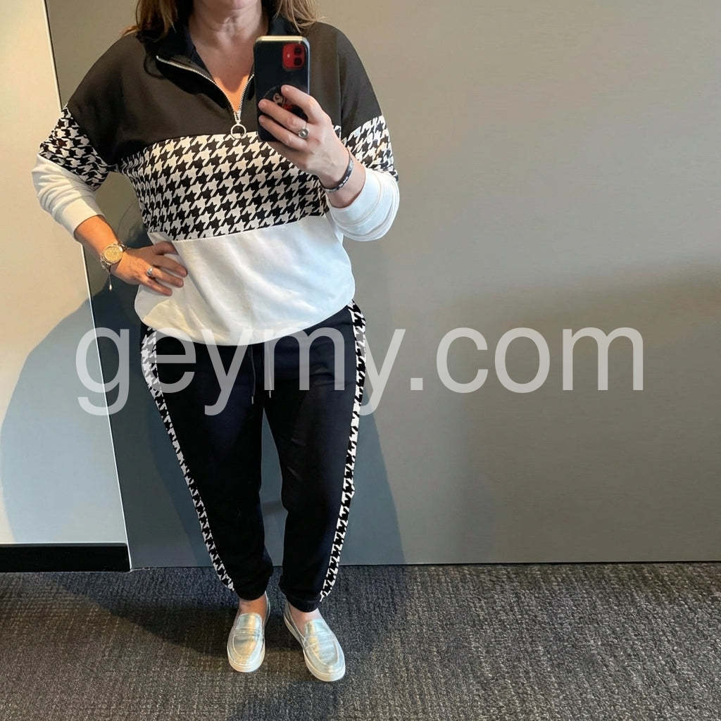 Unique Houndstooth Print Long Sleeve Two Piece Set