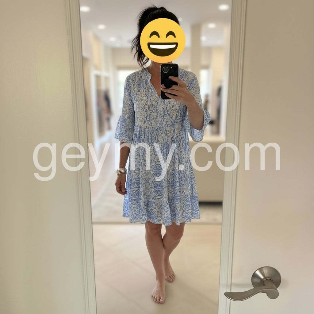 Weathered Blue White Vintage Print Half Sleeve Mini Dress