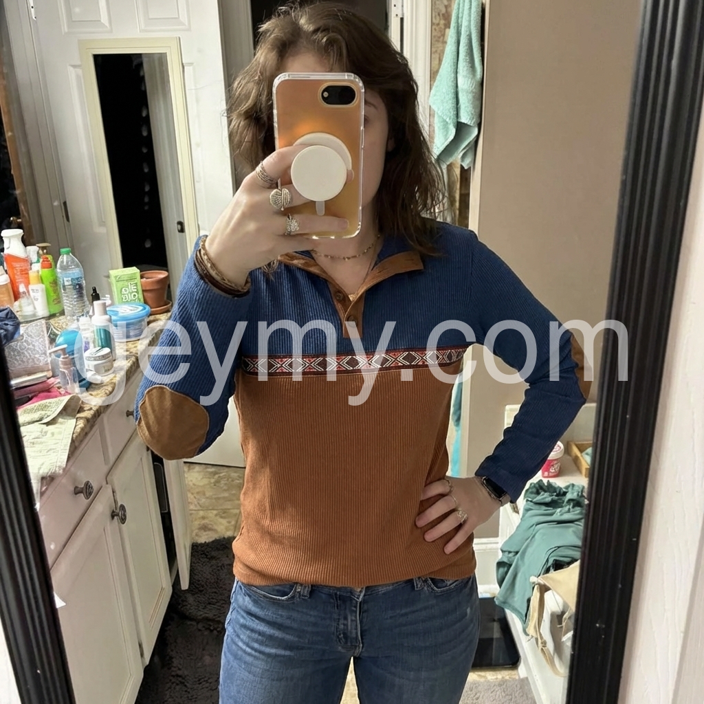 Elevate your casual wardrobe with this sophisticated brown long sleeve top, featuring contrasting color block panels that add visual interest and dimension. The signature elbow patches deliver timeless preppy appeal while reinforcing high-wear areas for enhanced durability. Crafted for versatility, this piece transitions seamlessly from weekend errands to relaxed office settings. The structured long sleeves provide coverage and warmth, making it an ideal layering piece for transitional seasons. A refined choice for those who appreciate understated style with functional design details.
