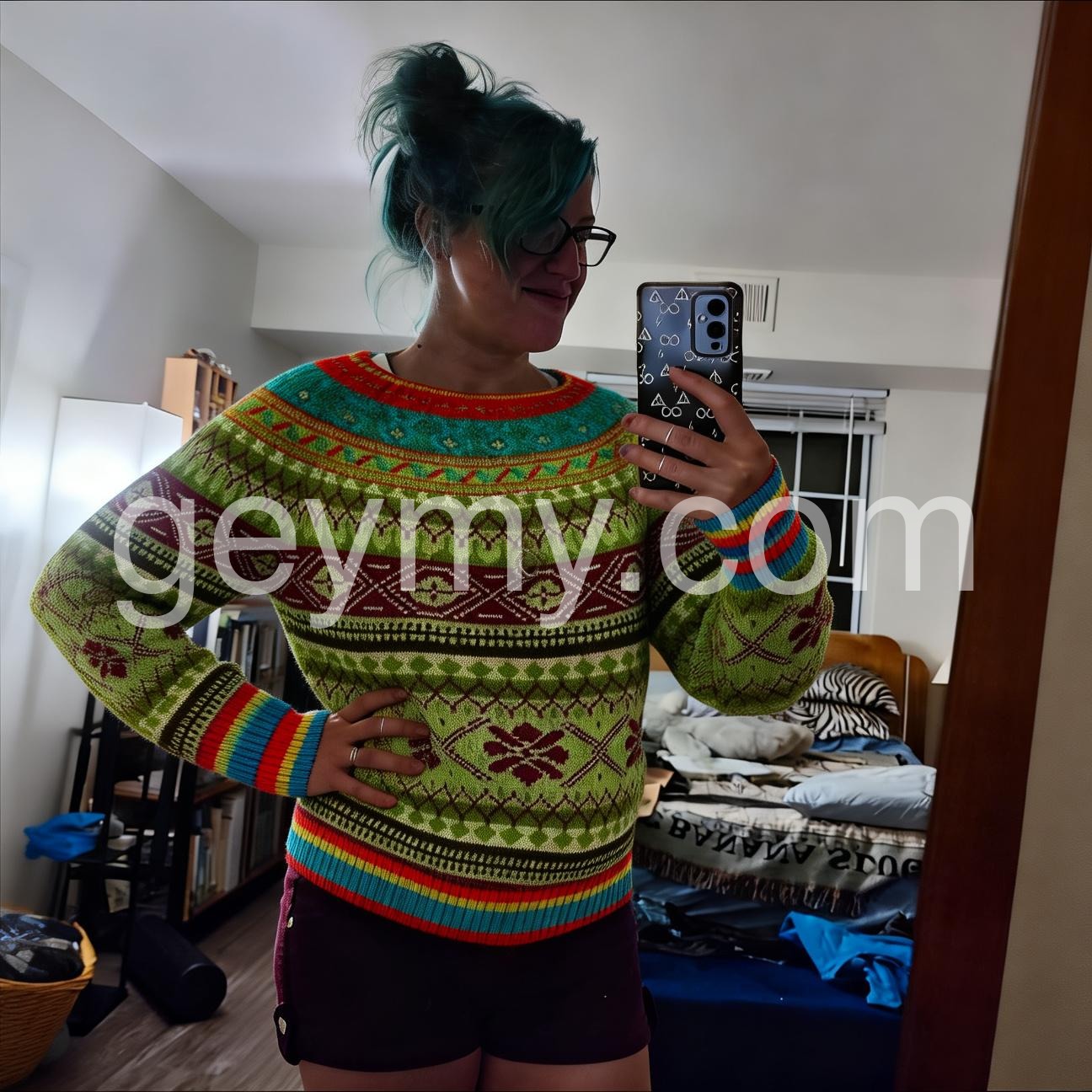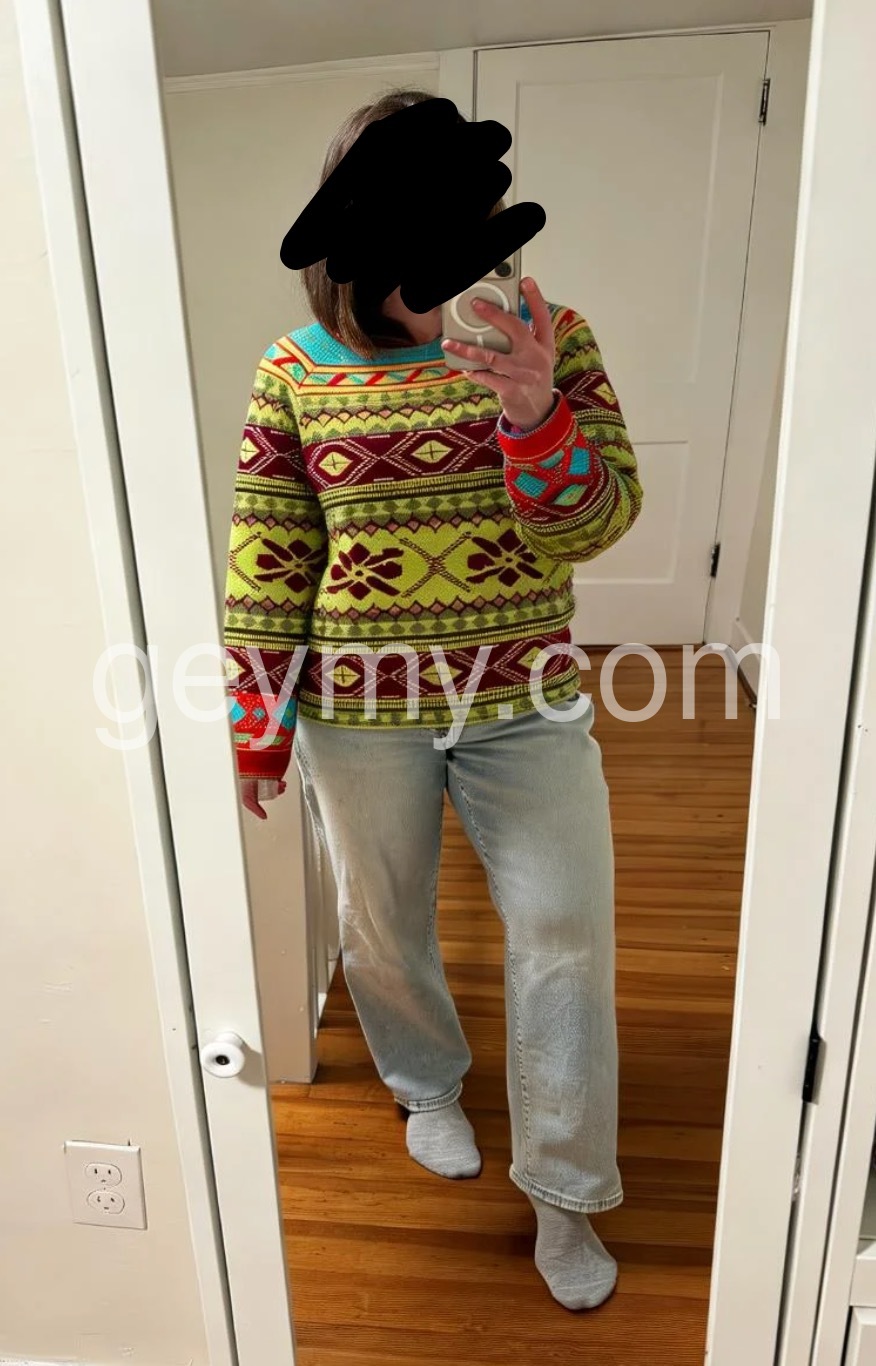 This sweater is such a fun and vibrant addition to my wardrobe! The mix of bright lime green, deep burgundy, and pops of turquoise in the classic fair isle pattern is so eye-catching—you can’t help but smile when you put it on.