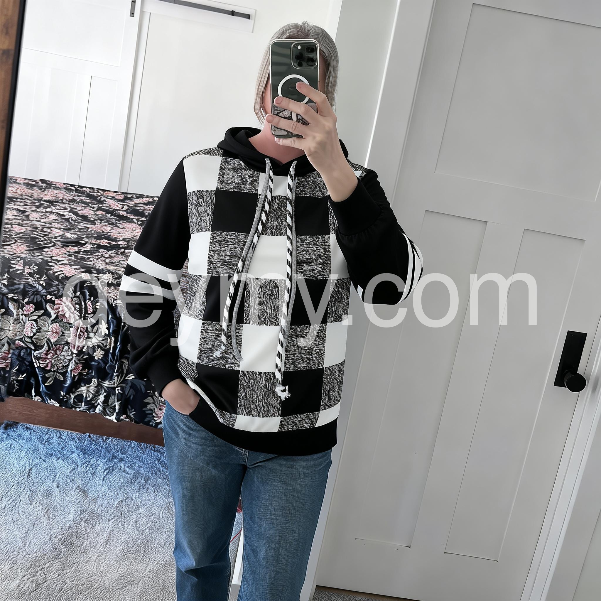 Keep it retro-classic with this black and white checkered hoodie! Repeating white and black blocks makes this comfortable hoodie a must-have for your casual days, along with two stripes on the black long-sleeves for a retro look. The drawstrings are made to match, giving this fashionable hoodie a non-stop black and white design.