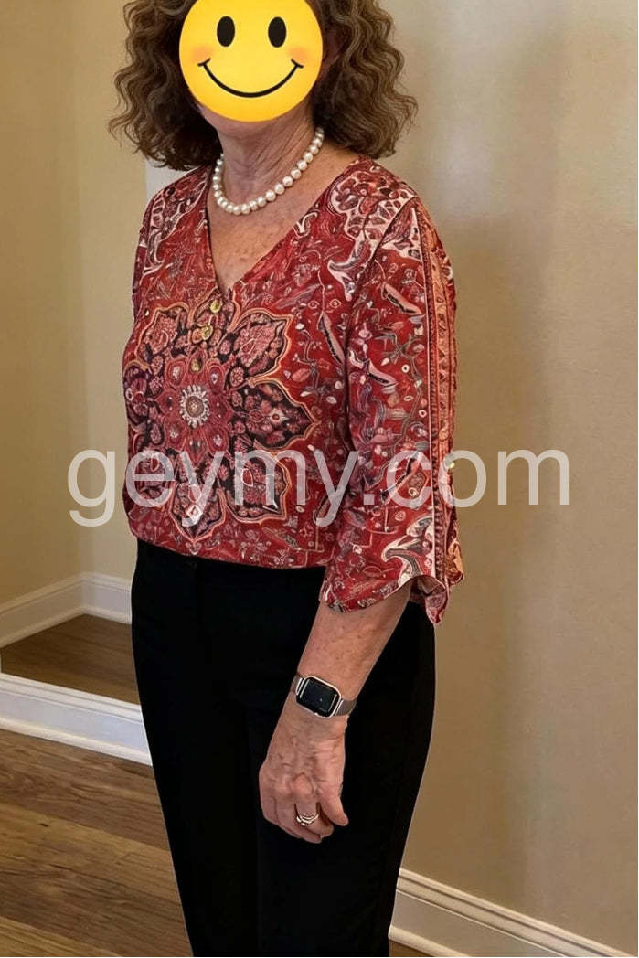 A vibrant bohemian blouse featuring an intricate red paisley print. This elegant top showcases a classic V-neckline adorned with delicate buttons, adding a touch of sophistication. The three-quarter length flared sleeves create a flowy, feminine silhouette, perfect for both casual outings and more dressed-up occasions. Crafted from lightweight, breathable fabric, it ensures comfort all day long.