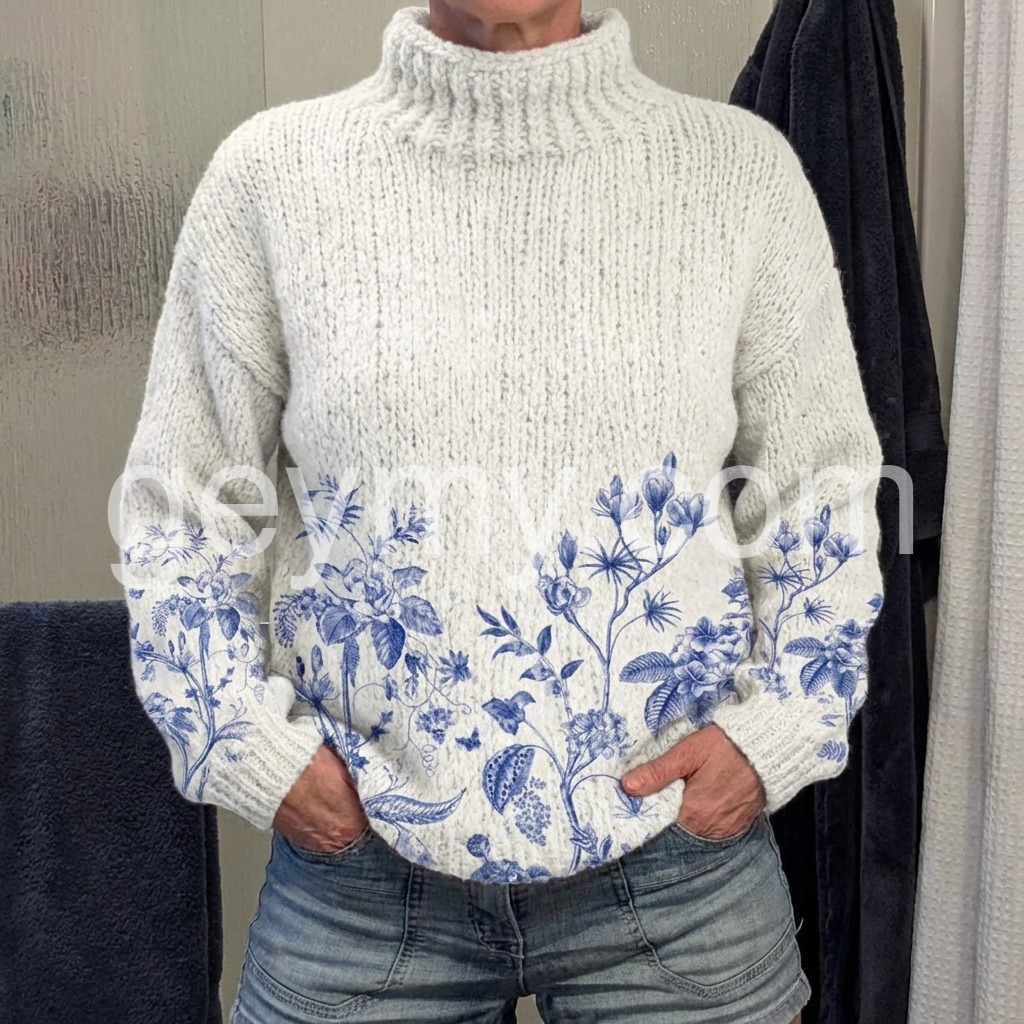 Fresh Plant Print Mock Neck Sweater