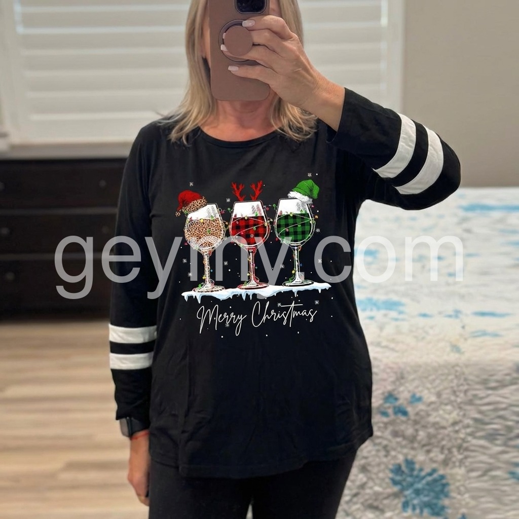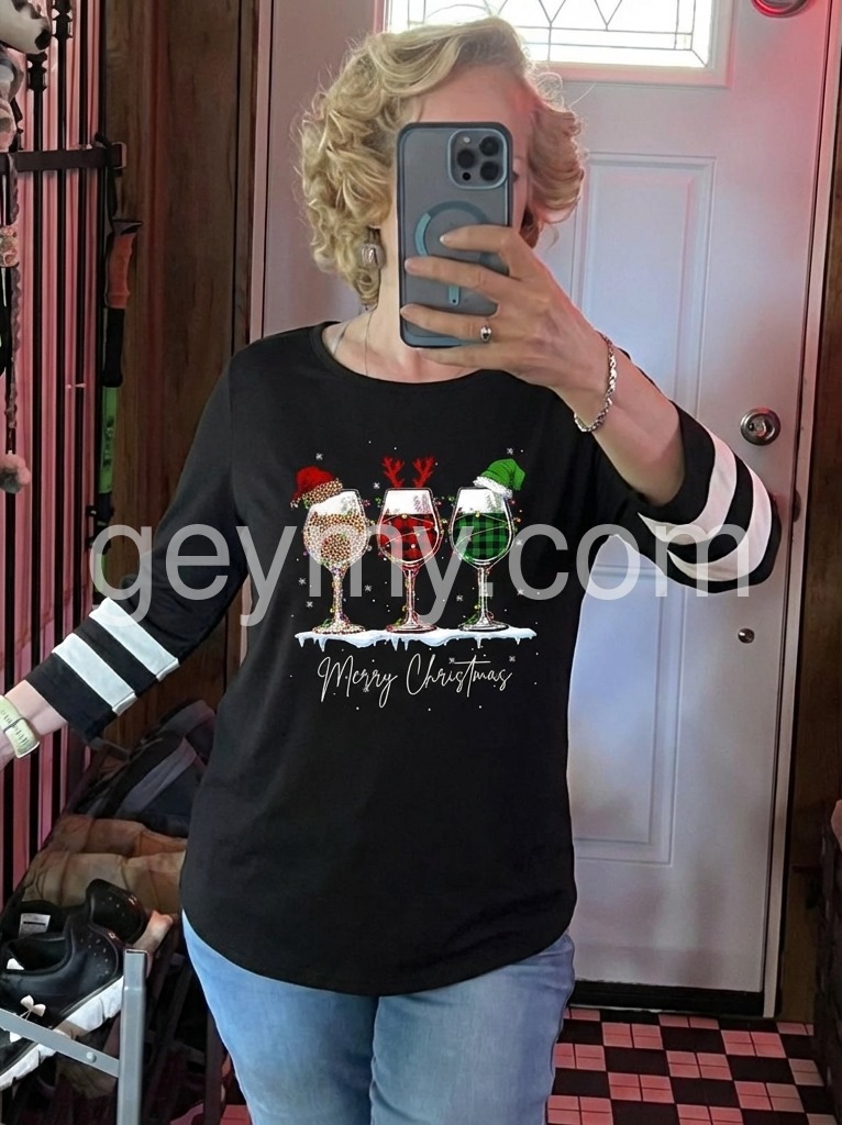 Cute holiday, 3/4 sleeve tunic. Beautiful print with Merry Christmas. Ordered size L. This is a little long for my preference but I can tuck or tie. I am 5’4” and 150.