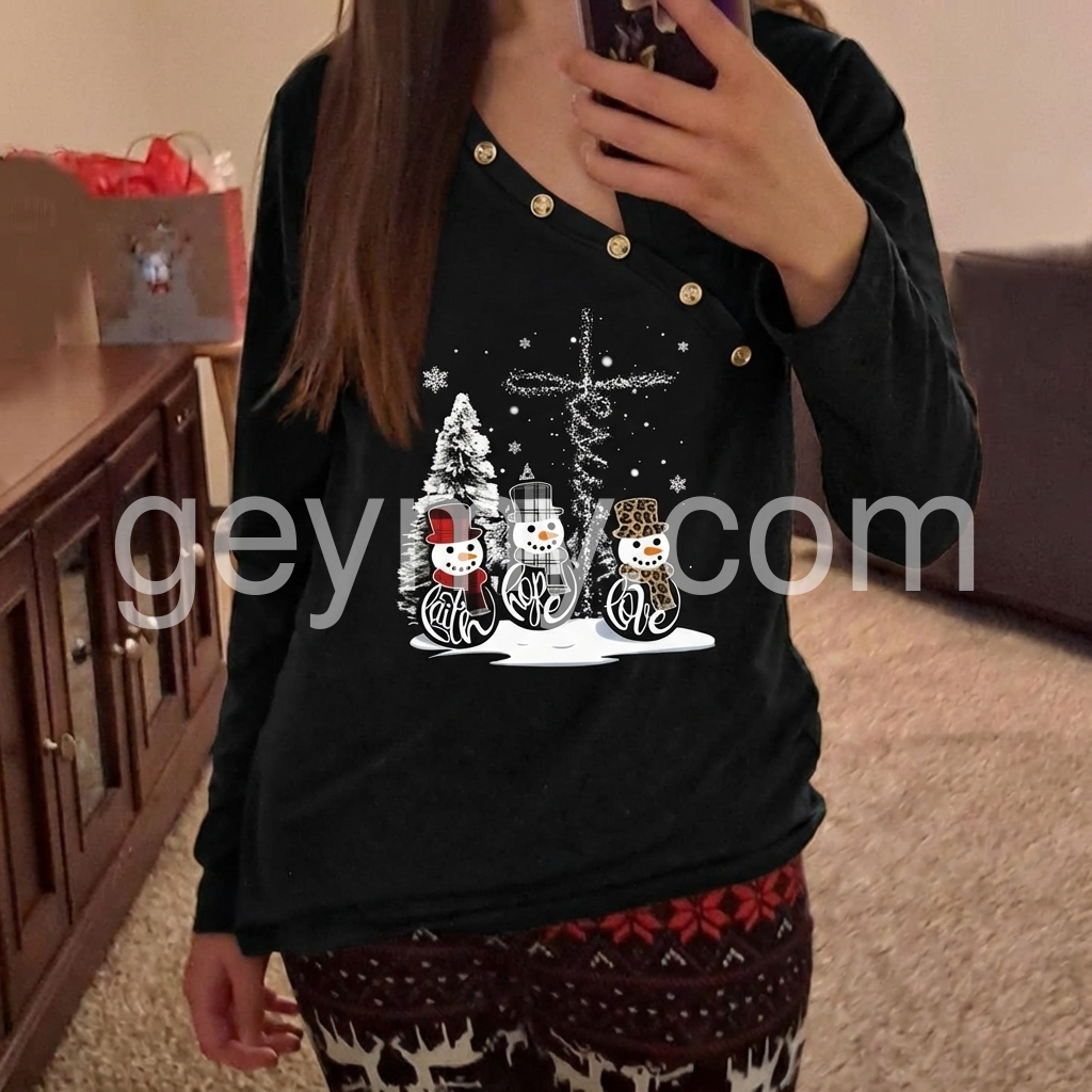 Add this cozy long sleeve top to your winter wardrobe, featuring adorable snowmen and a Cross, a Christmas tree, and falling snowflakes that set the stage for a super-fun holiday party, Christmas vacation, and so much more. An asymmetrical button front collar gives it a contemporary vibe.