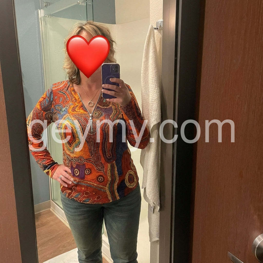 Autumn Aztec Geometric Zippered Long Sleeve Top